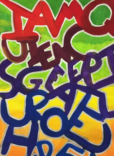 A couple years ago, I was at an art teacher conference and the amazing #CassieStephens was the keynote. She spoke about how when your personal art endeavors align with your art teaching projects, it's magical...and I knew she was right. I had been creating abstract paintings incorprating text, while simultaneously teaching my 5th graders about color theory, composition, and so much more through an "I am..." project. The heart of the project is that they chose a number of positive character traits to highlight in their abstract text-based painting. And, really, the fact that I was doing something similar in my personal work made me feel more exuberant, my teaching more engaging, and my students, more receptive and excited about it.